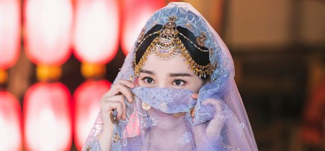 画中的女子一身紫衣,紫纱半遮面,不似中原打扮,反倒是异域服饰,她身后有街市的灯笼盏盏,暖黄色的灯火映出喜庆的朱色。