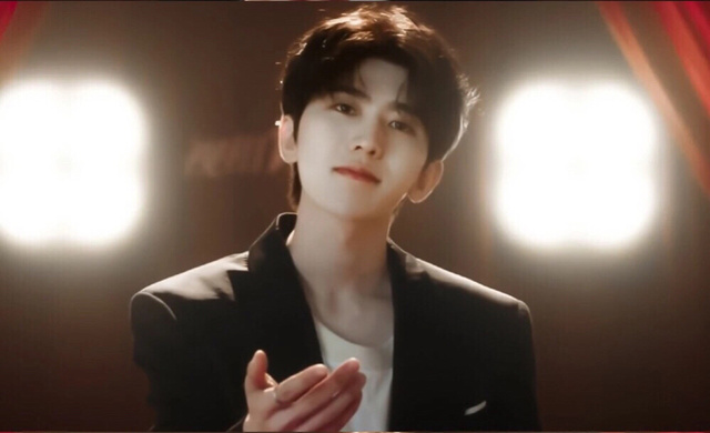 少年白色内搭之外套着黑色的西装,裤型笔挺,修饰出双腿的修长。