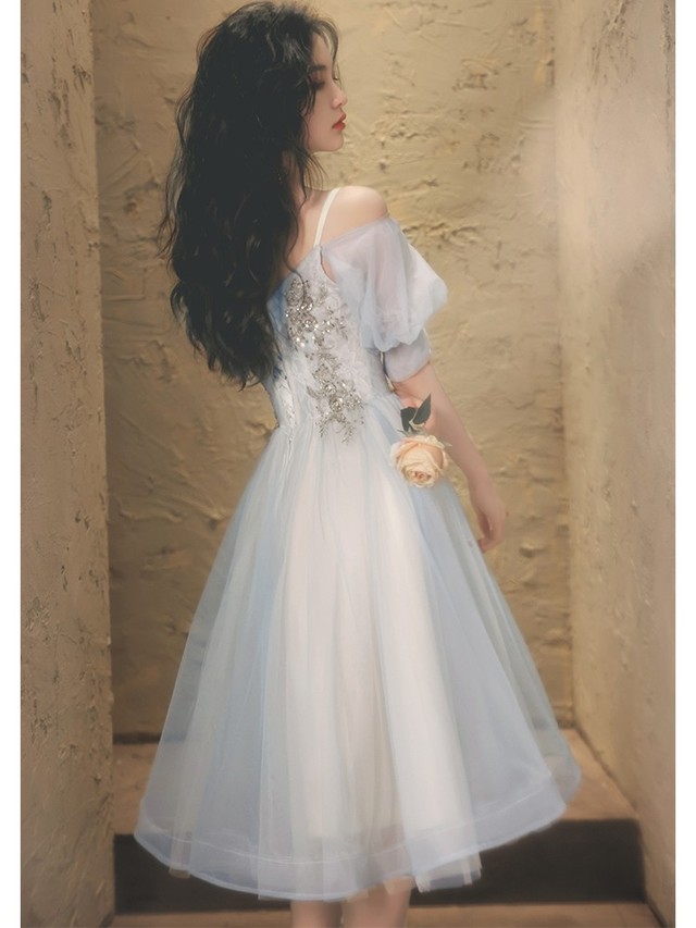那少女一袭淡蓝色露肩连衣裙,美丽的锁骨若隐若现,裙子的纱料微微透着些白,裙底的弧线微微蓬起,背后则是金色蕾丝花边的设计。少女露出哪双白玉修长的腿,点缀些许碎钻,星星点点的钻,恍如清晨的朝露