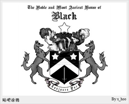 “是布莱克家的猫头鹰”斯卡曼德夫人看见了猫头鹰叼着的信封上的家徽。是一个饰有一个山形符号、两个五角星和一把短剑的盾牌,盾牌两边是两只跃立的灰狗。用纹章学的术语来说就是:“黑色,两星之间山形为主体,一剑为基础,银质。