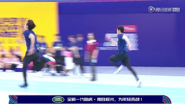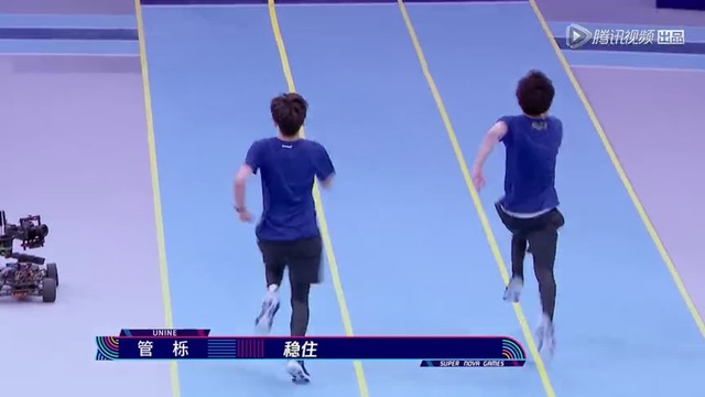 临近终点线时,管栎由于重心不稳摔到了地上,然后一个后空翻翻过了终点线