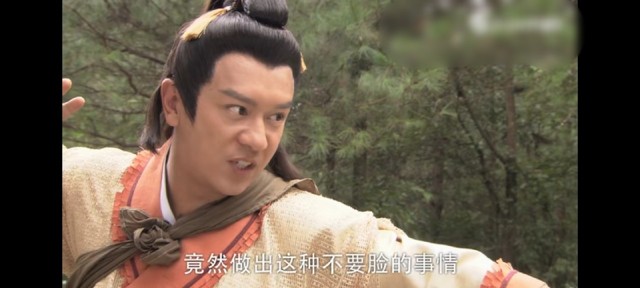 正义的薛平贵见到蒙面的黑衣男子,便开始出掌,对那蒙面黑衣男子大声怒吼道