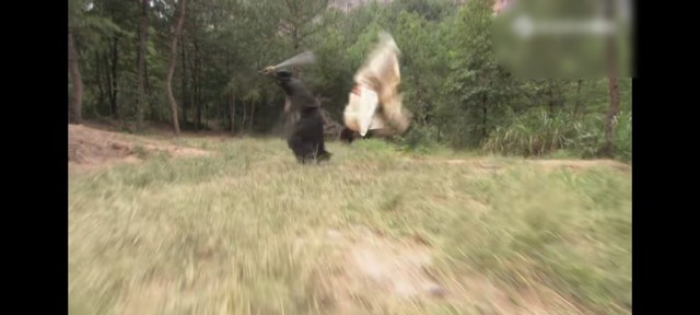 王宝钏这两个人打架的样子好可怕哦!那个黄衣服的男人差点就被蒙面的黑衣男子用剑给劈到了……