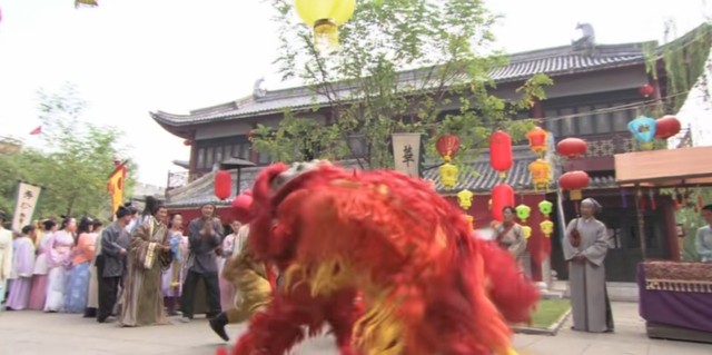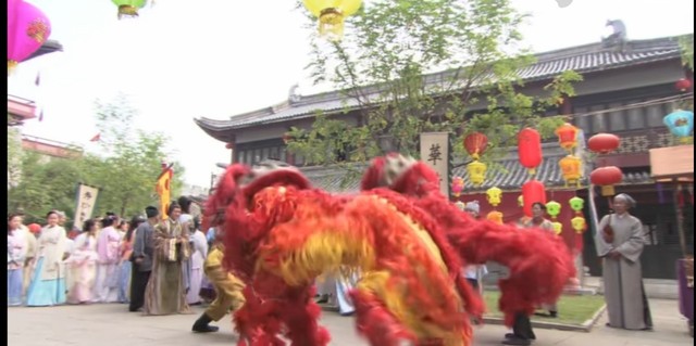 热闹繁华的集市上,有人在舞狮子。