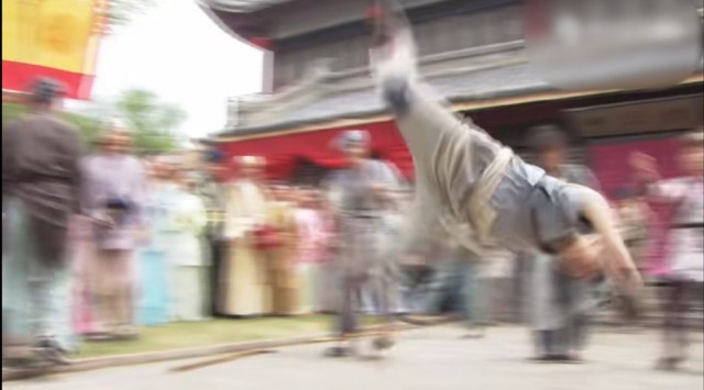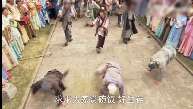 围观群众听到还有表演看,并未走远,然后几个乞丐就翻跟头唱歌跳舞来,边唱边跳。