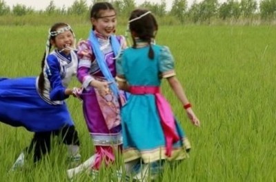 (古代老鹰捉小鸡是民间游戏,无论大人小孩子都可以玩,也不知道哪部电视剧有,并不好找,只能意思一下,在度娘那找了蒙古三姐妹老鹰捉小鸡的配图,看图的读者请把草地衣着妆容忽略掉吧。)