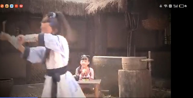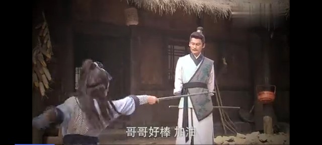 父亲薛浩教薛平贵练剑,自己笑得很开心,坐在一旁为哥哥加油打气