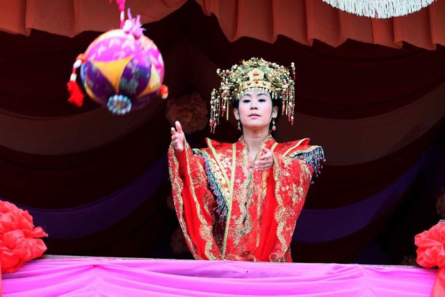 薛郎,你果真不负所望,来到了宝钏我的绣楼招亲,看来梦中的一切都是真的,今天我王宝钏的绣球一定要抛中你,让爹爹看一看这就是天意!