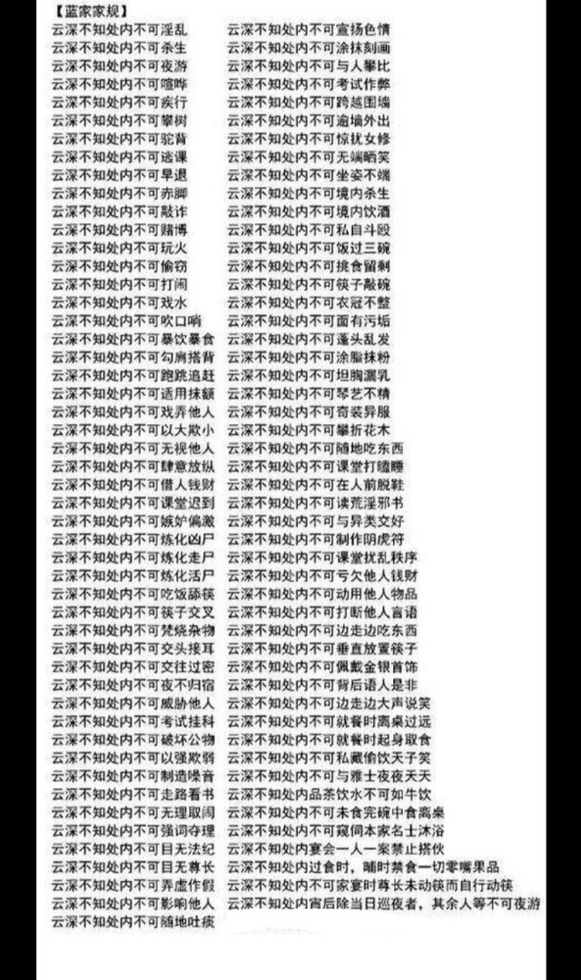 蓝湛家规五百遍。不抄完不许吃饭,睡觉,回家。不许抄错一个标点符号。不然翻倍重抄。