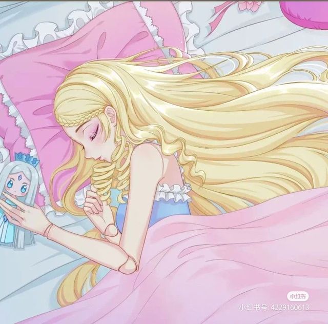 床上少女双眼微闭,透露出一丝痛苦,一头美丽的金色长发,散落在床头,像一位优雅的睡美人。