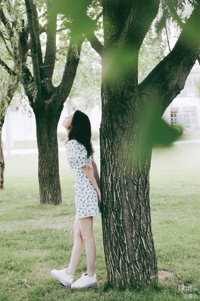 不远处的兰燕,靠着柳树,歪着头仿佛在等着什么人,手里拿着一瓶水,有点无聊了还一颠一颠的。