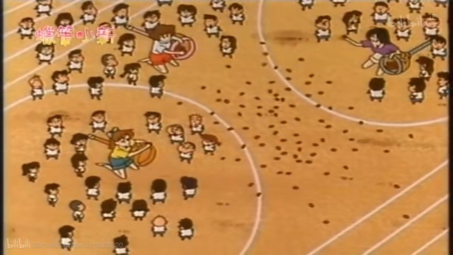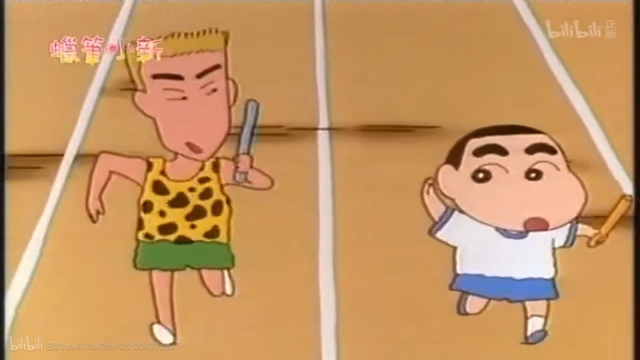 小新轻轻松松地开跑,然后轻轻松松地被河村豹追上,吉永老师紧张极了,松阪老师得意地大笑。