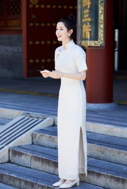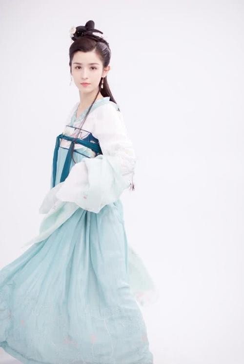 她将 一头黑色长直发高高盘起 ,身穿一件带有薄纱设计的长裙款式版型,淡雅的青湖色分了内外两层的双纱设计,能展现一股“仙气感”。
