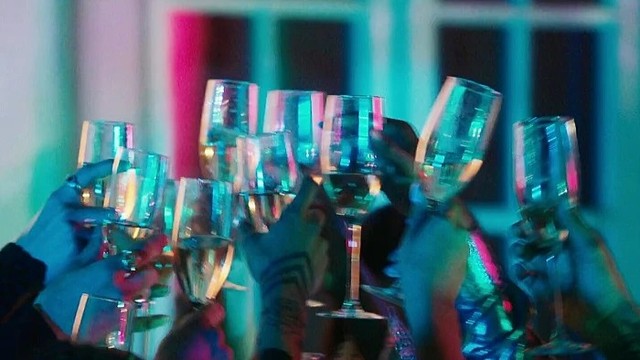 举起酒杯笑着和他们相碰。