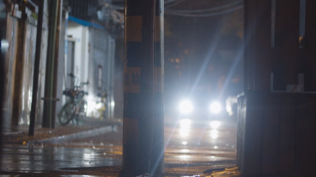 几辆车缓缓驶进巷子里,车轮碾过激起地面的积水。