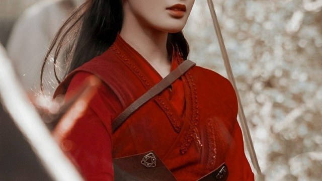 身穿赤红战衣,墨发随着风吹的方向肆意飘摆,单手持红棕战马,飒爽英姿。