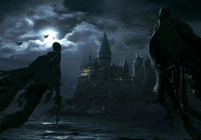 你们钻进一辆马车,颠簸摇晃着向前行进,两个摄魂怪一边一个在门口站岗