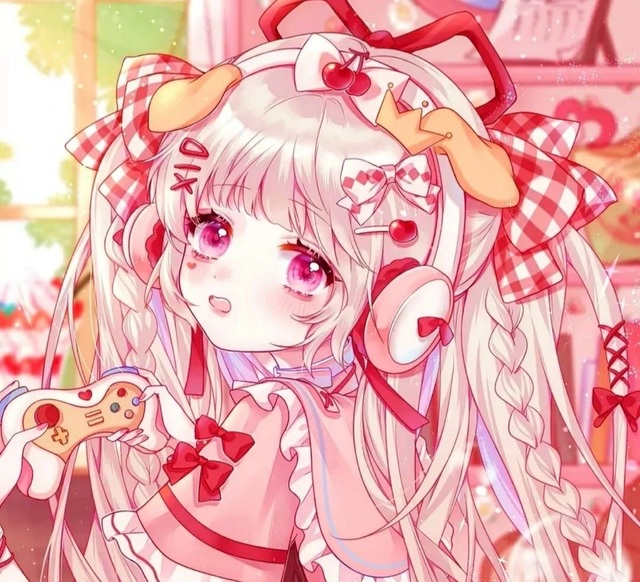 一个可爱的女孩,有一头粉红色的长发,前面扎着两根细细的麻花。她的头上戴着红色的耳机,还有几个漂亮的蝴蝶结,十分萌。一双粉红色的大眼睛,真的好可爱呐!这个小孩手里拿着游戏机,不知道在玩什么呢,想玩儿。