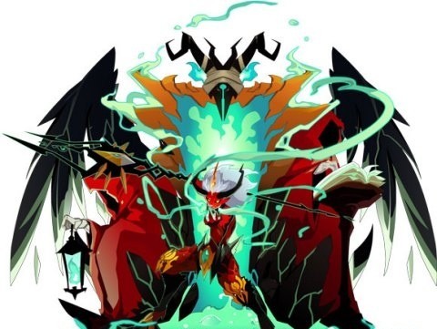 那个被称作为暴虐帝皇的精灵——不,不如说他是一个带来恐惧的邪神,右手提着一根乌黑色的细长枪,而逝者巨樽漂浮在他的左手之上,白色的头发衬托出他那赤红色的脸庞,墨绿色的气体环绕在他的周围,额头上还长着一对说不出像什么的犄角,一扇似乎有着生命的大门在他身后敞开着,大门上的手还提着一盏灯,灯里燃烧着诡异的绿色火焰