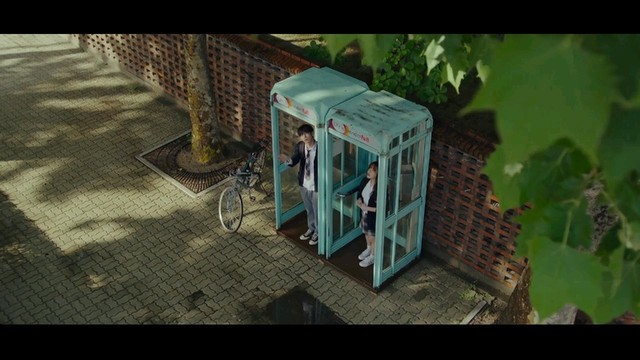 到了公交车站,天空不做美,下起了大雨,还好两人是在车站,还能躲一下雨