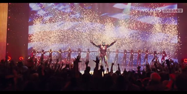托尼穿戴上马克四号装甲,从高空中风骚降落在舞台中央大方承认自己是钢铁侠。