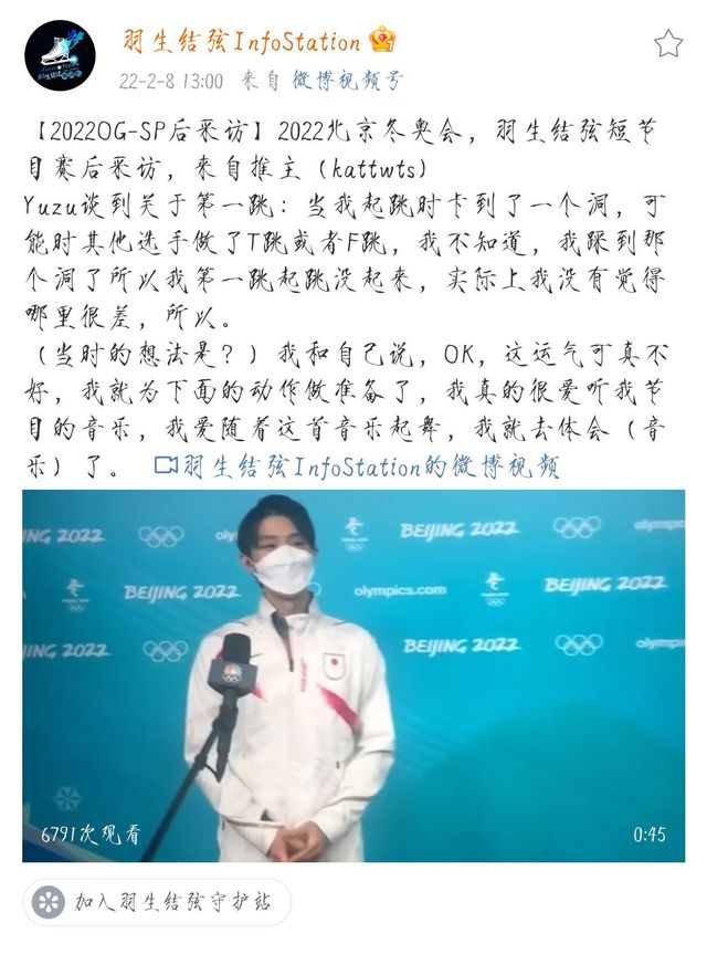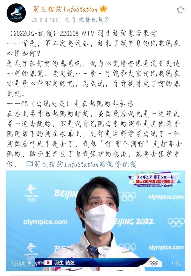 羽生结弦男单短节目赛后采访,第一跳跳空的原因:起跳时发现发力点的冰面有洞,冰刀卡住了