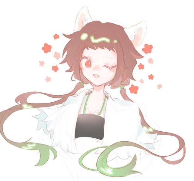 外貌方面:扎着亚麻色的双马尾低垂在肩膀上,尾间带着葱绿,白绒绒的披肩随着那人的摇动轻轻晃悠着,胸前挂着一个三片树叶组成的项链,身着褐色加草绿色的连体裙,以及树桩淡棕色的长靴,头上的耳朵和尾巴晃了晃,青春少女的模样