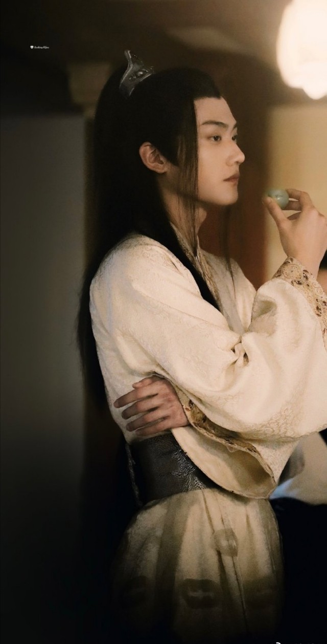 他一手抱臂,一手端着青玉酒杯,立于一块大石头上,身下就是离他起码十米的池面。夕阳将他的影子拉的很长,额前刘海被来自御池湖面的风撩起,温柔的金光带着微尘落在他起伏清冷的面容,增添了温柔更多了落寞孤寂。