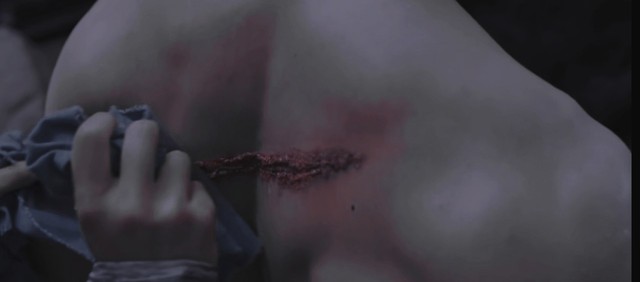 小蛮处理好药草,欲给男子上药,发现他的伤口早已和衣服粘在一起,小蛮小心翼翼的把男子背后的衣服剪开,不禁意的触碰到他结实的肌理都会脸红