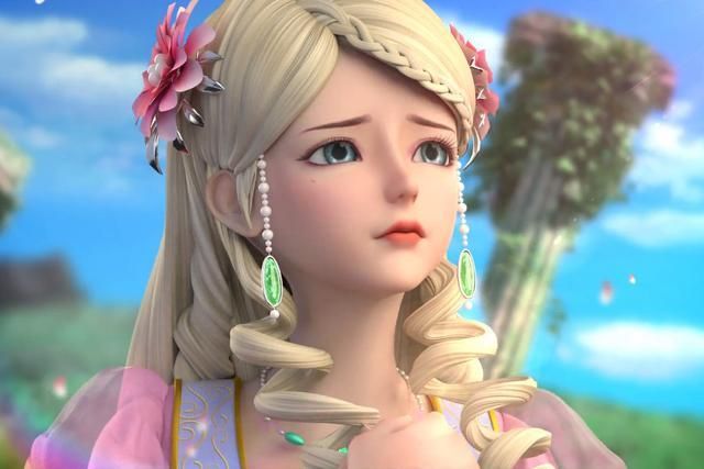 灵公主有着金黄色的头发,两边鬓角各分出一缕呈螺旋状搭在胸口,头顶两侧各有一朵粉色大花,花瓣层层叠叠。三七分的斜刘海,左侧绑出一根细麻花辫延伸到耳后。脖子上戴着锁骨链,手腕上拴着缀大花的粉色手绳。