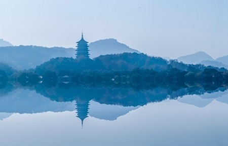 镜湖以清澈澄净而得名,波光粼粼的水面上还弥漫着迷蒙的晨雾,远处青山若隐若现,衬着诗情画意的湖景,应了那句“唯有门前镜湖水,春风不改旧时波。”