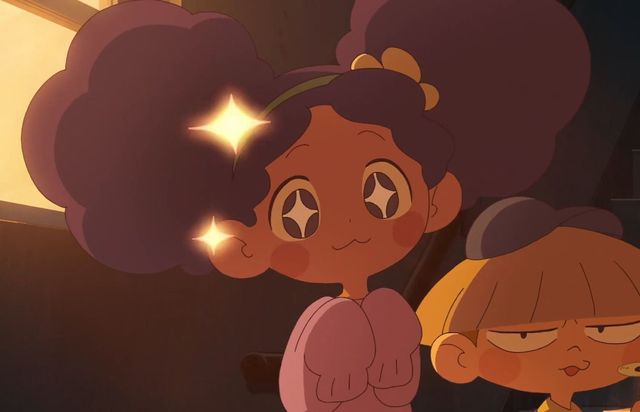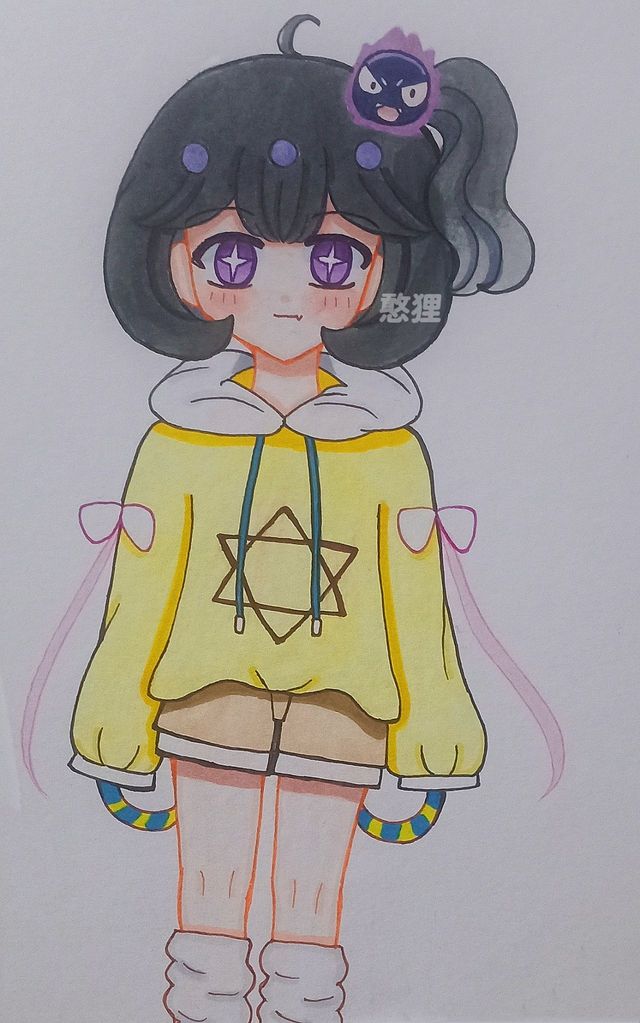 少女穿着连帽卫衣,深灰色短发侧边的小揪揪上别有一个鬼斯发夹,令人感到奇特的是她的瞳孔是星型的!只见她从树干上一跃而下并大喊:“鬼鬼我马上来救你!”