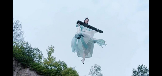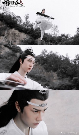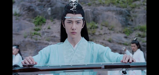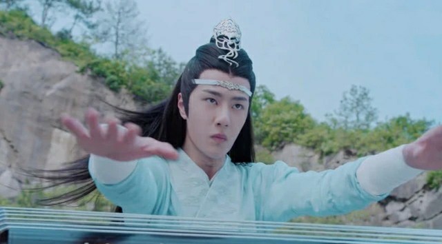 蓝湛弹奏着忘机琴自半空中缓缓下落