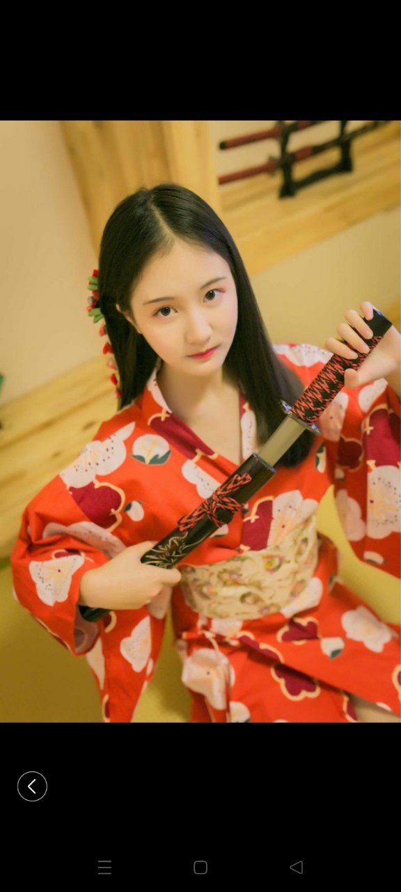 我拿了一件红色的传统和服。在试衣间穿好走了出来