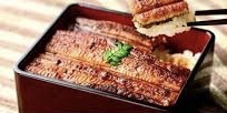 她用右手筷子一手夾著米飯和鰻魚,慢慢品用。