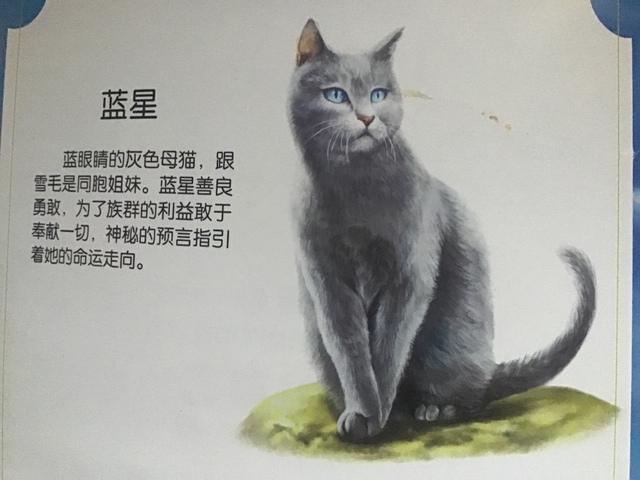 蓝星蓝灰色母猫,蓝眼睛。雪毛的妹妹。善良,勇敢。为了族群的利益敢于奉献一切,雪毛死后蓝星替她抚养白风