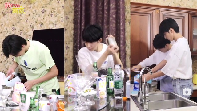 丁程鑫先把冰倒进去,再放点水果,最后把饮料浇在上面