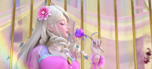 灵公主斜靠在金笼边上,看起来慵懒随性。