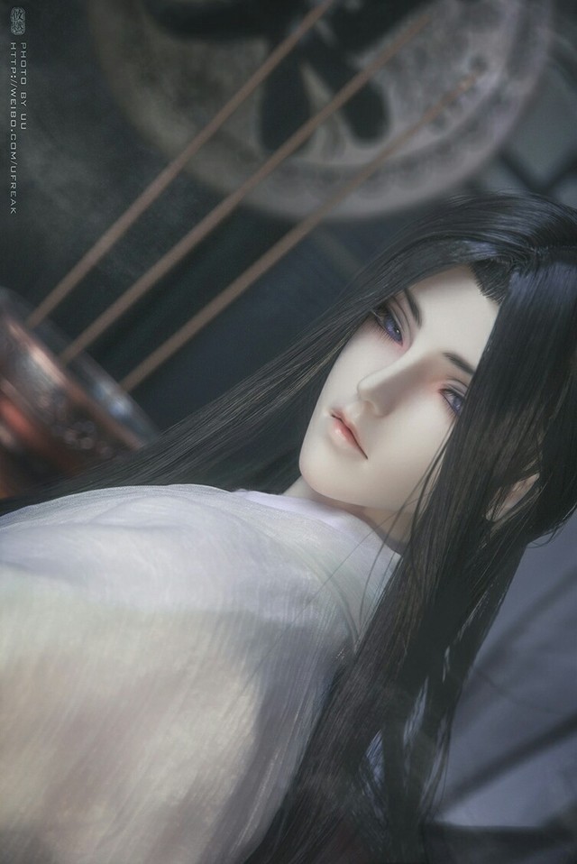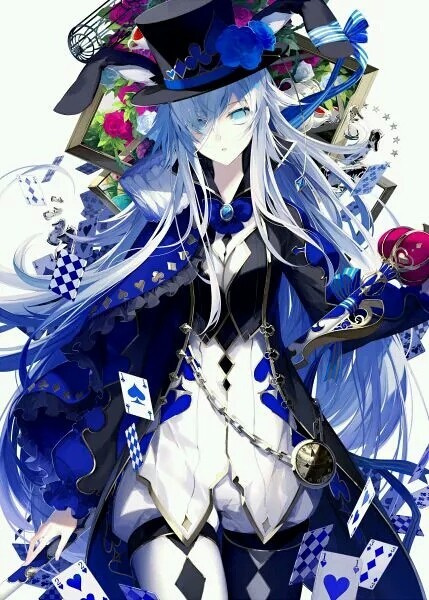 伴随着金色的余光,银白色的长发如月色般皎洁,额间是一个淡淡的梅花印记。蓝色的披风,一身魔术师礼服尽显魔术师的神秘风范。礼帽上点缀的蓝色妖姬泛着点点晶莹的蓝光,妖娆万分。
