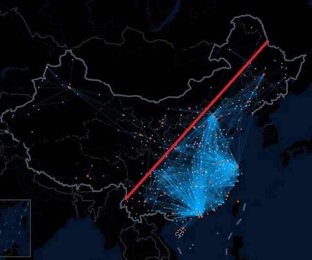 这是一条贯穿中国版图的假想直线段,中国历史与地理发展的一个分水岭,黑河—腾冲线,即瑷珲-腾冲线,该线从中国东北边境的黑龙江省黑河市(原名“瑷珲”)一直延伸到中国西南边境的云南省腾冲县,大致地划分出了中国人口在区域上的分布,体现了中国人口东南和西北的分布区域之悬殊差异。