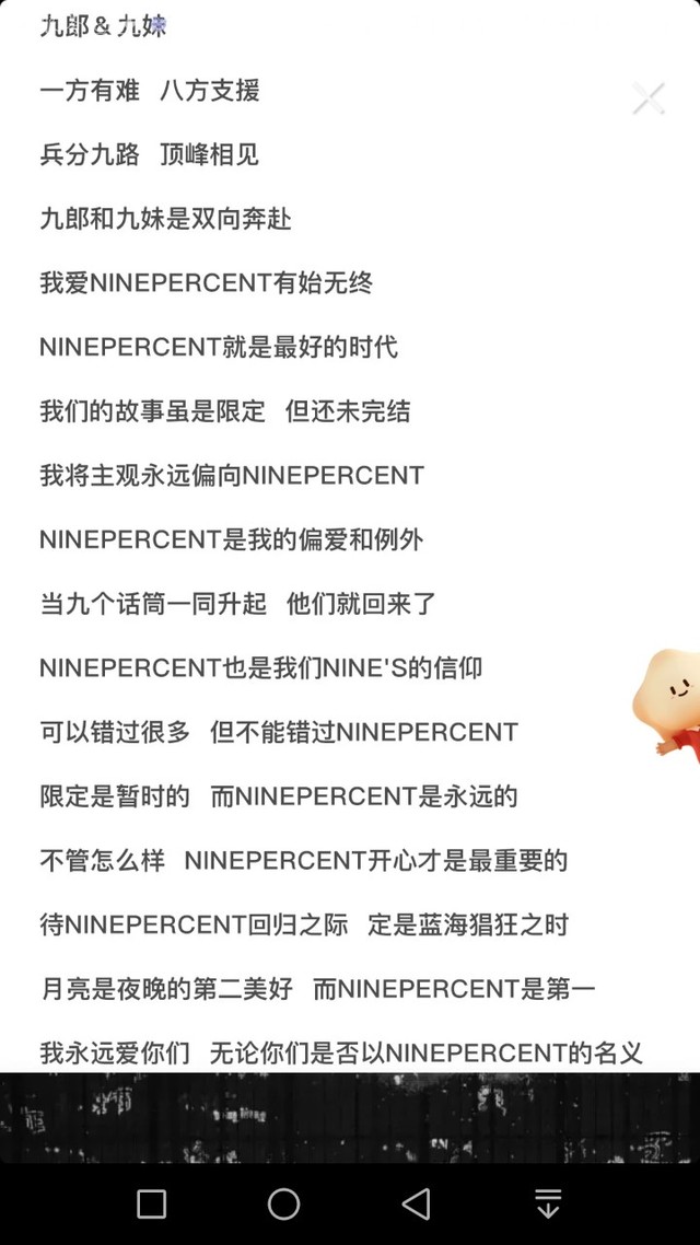 九妹九郎&九妹 方有难八方支援 兵分九路顶峰相见 九郎和九妹是双向奔赴 我爱 NINEPERCENT有始无终 NINEPERCENTE就是最好的时代 我们的故事虽是限定但还未完结 我将主观永远偏向 NINEPERCENT NINEPERCENT是我的偏爱和例外 当九个话筒一同升起他们就回来了 NINEPERCENT也是我们NINE'S的信仰 可以错过很多但不能错过 NINEPERCENT 限定是暂时的而 NINEPERCENT是永远的 不管怎么样 NINEPERCENT开心才是最重要的 待 NINEPERCENT回归之际定是蓝海猖狂之时 月亮是夜晚的第二美好而 NINEPERCENT是第 我永远爱你们无论你们是否以 NINEPERCENT的名义