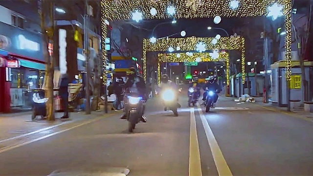 闹市里一处酒色香艳的酒吧一条街上前后几辆摩托在路上纠缠!