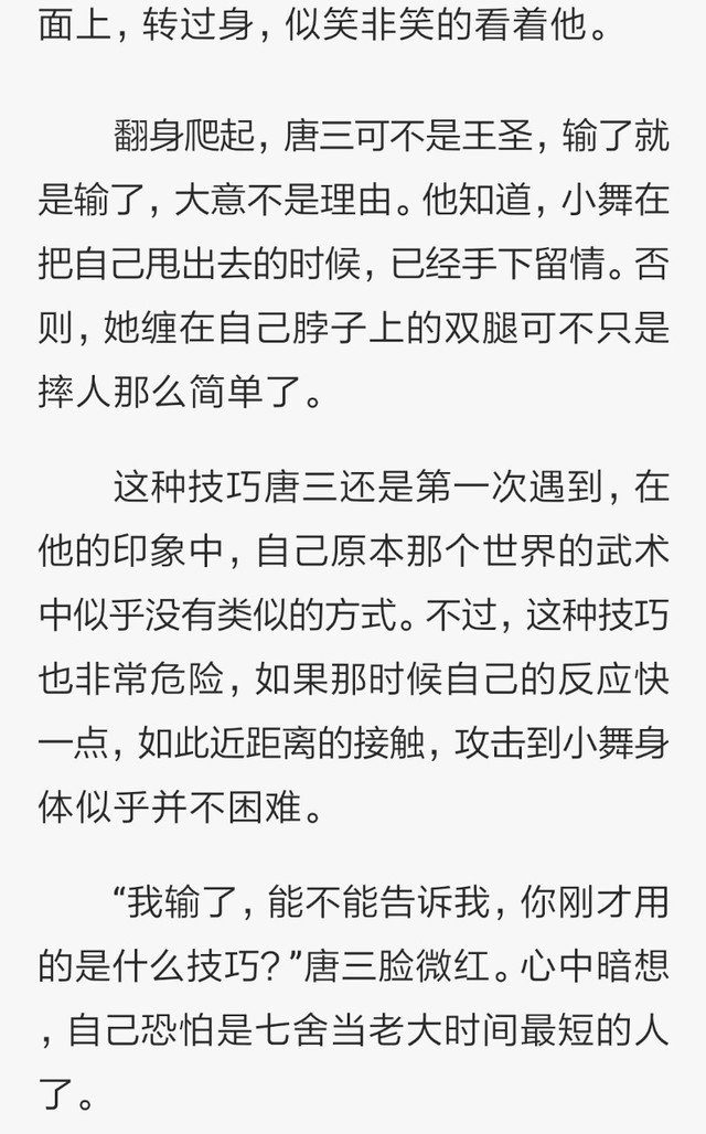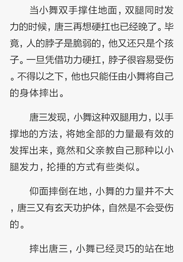此时的样子看上去十分怪异,小舞的两条腿竟然缠上了唐三的脖子,借助唐三肩头前顶之势,上身后仰双手撑在地面,柔软的双腿就像是弹簧一般,竟然就这么早住唐三的脖子将她向后摔去。
