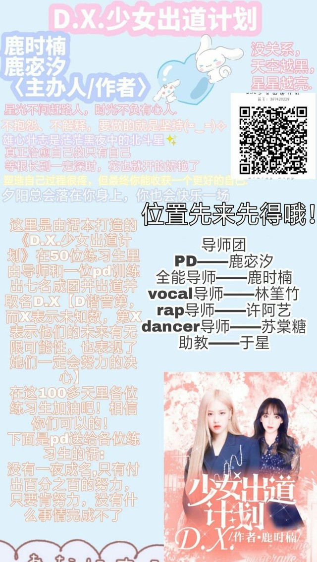 PD·鹿宓汐这里是由话本打造的《D.X.少女出道计划》在50位练习生里由导师和一位pd训练出七名成团并出道并取名D.X【D谐音第,而X表示未知数,第X表示他们的未来有无限可能性,也表现了她们一定会努力的决心】 在这100多天里各位练习生加油吧!相信你们可以的! 下面是pd送给各位练习生的话: 没有一夜成名,只有付出百分之百的努力,只要肯努力,没有什么事情完成不了