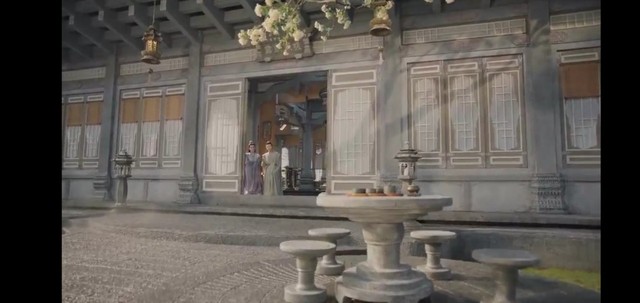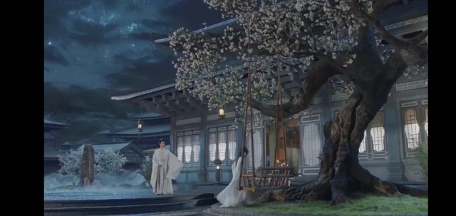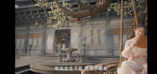 上古手拿着竹简侧坐在秋千上,玥璃同坐此并在一旁静静看着。
