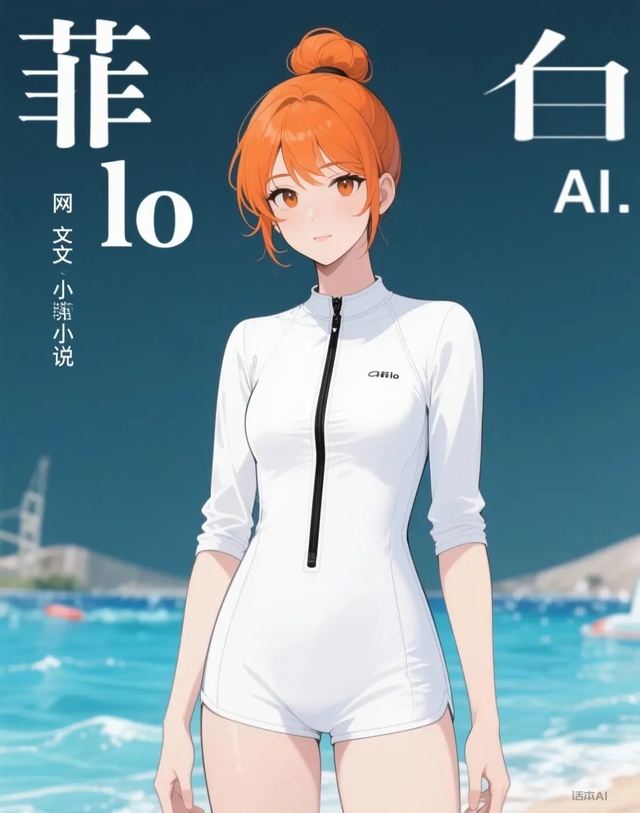 纯白色中袖短裤连体泳衣,暖橙色长发干练地扎成丸子头,未施粉黛,肌肤胜雪。