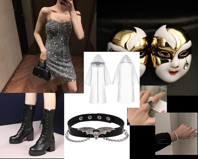 我脸上戴了一个白金面具,身上穿了一条银色亮片吊带裙,手提鳄鱼皮小黑包,脚上一双高跟长筒靴,外面套了一件白色长袍,毕竟是黑市嘛,还是不要露脸的好