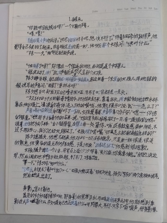 陈汐慢慢睁开眼,阳光斜斜着打在他身上,照着雪白的床单反出几道光——这像是一张病床。他虚弱地扭动着仍不太灵活的颈子,看见他正在一间略显狭窄的木屋中,躺在病床正中间。床头坐看一个长头发的女孩,正用乌黑的眼睛端详着他。嘴角抿成一条线,严肃而略显天真。她用她银铃般悦耳的嗓音问:“醒了?要杯水吗?”