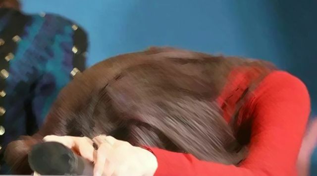 江意拿着麦克风 瘫倒在桌子上