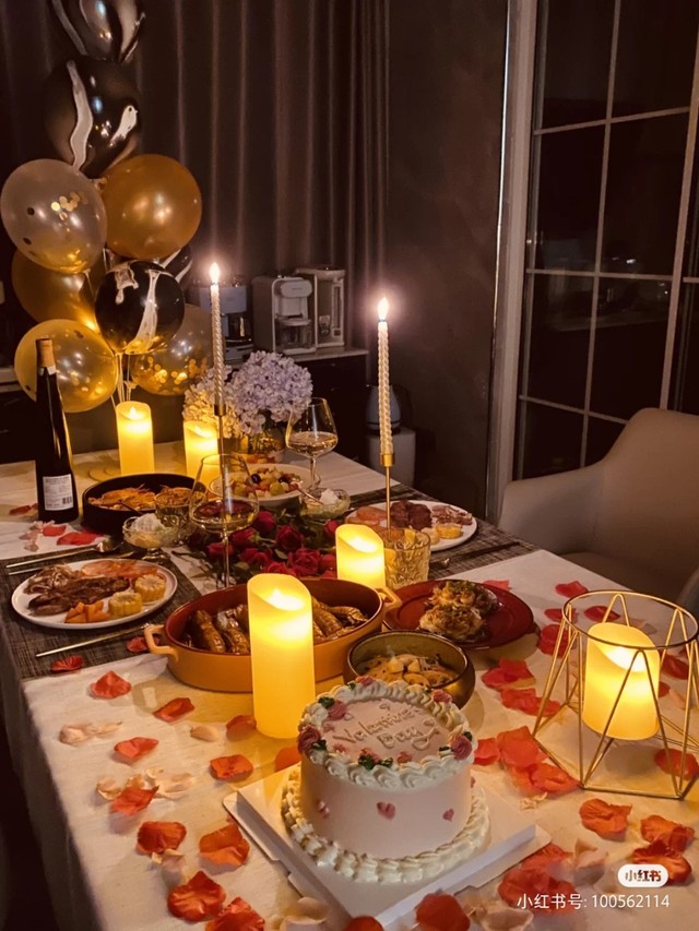 地上铺满了玫瑰花,旁边一个一个的小蜡烛,让这个房间充满了温暖和烟火气息